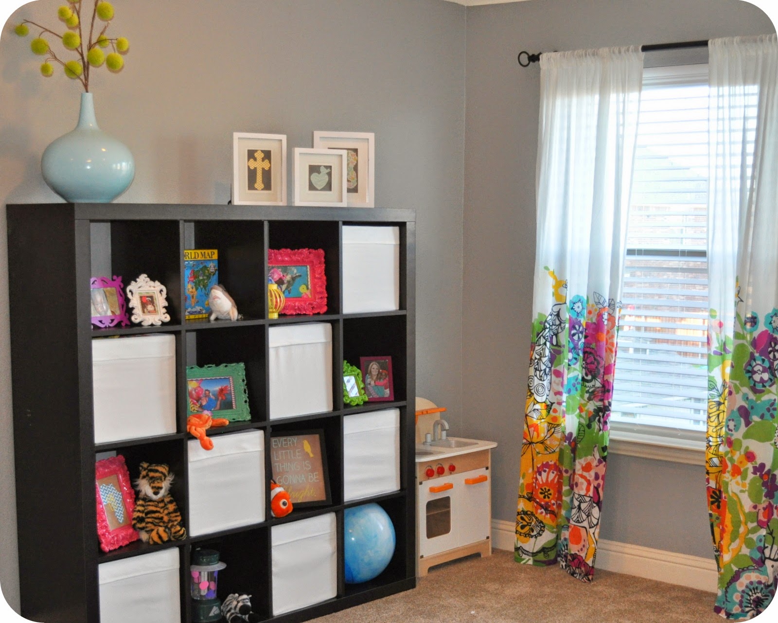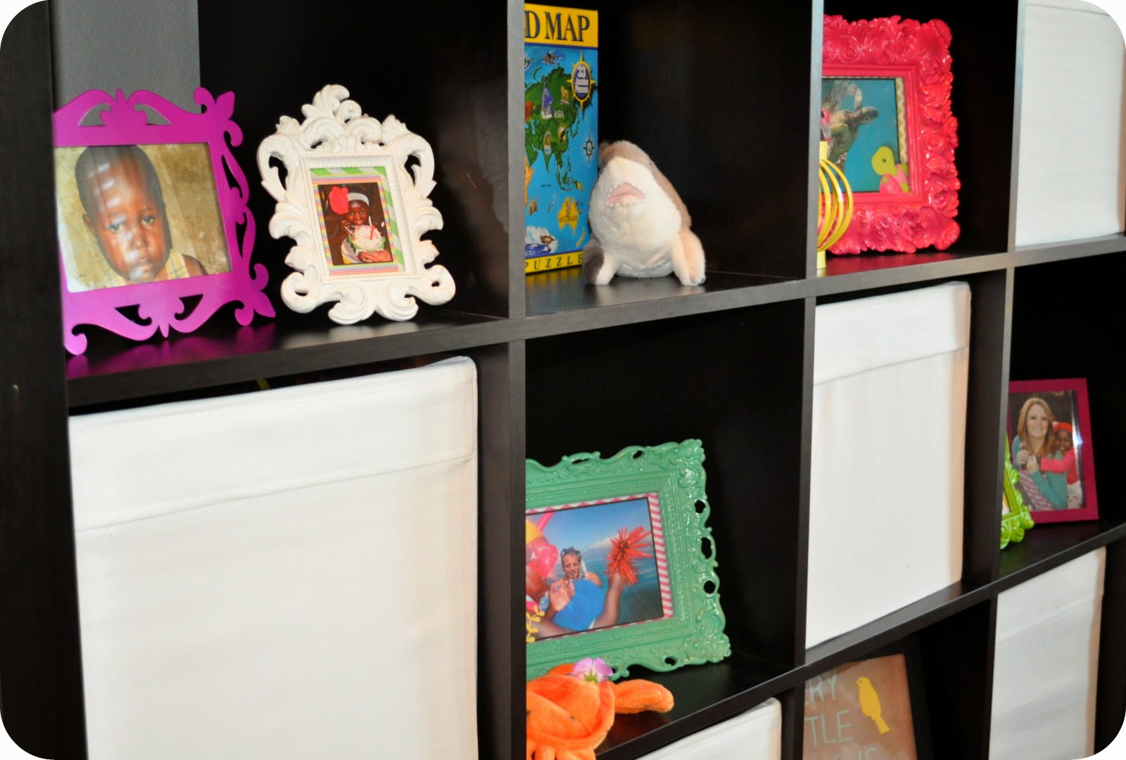This cube storage unit came from Ikea years ago, but I’m sure they still have them. The white bins are from Ikea also, and they hold a lot of Joelle’s toys. I put a bunch of colorful frames, small stuffed animals, and a few toys in the empty cubes for display. The colorful, chunky frames are from Hobby Lobby.