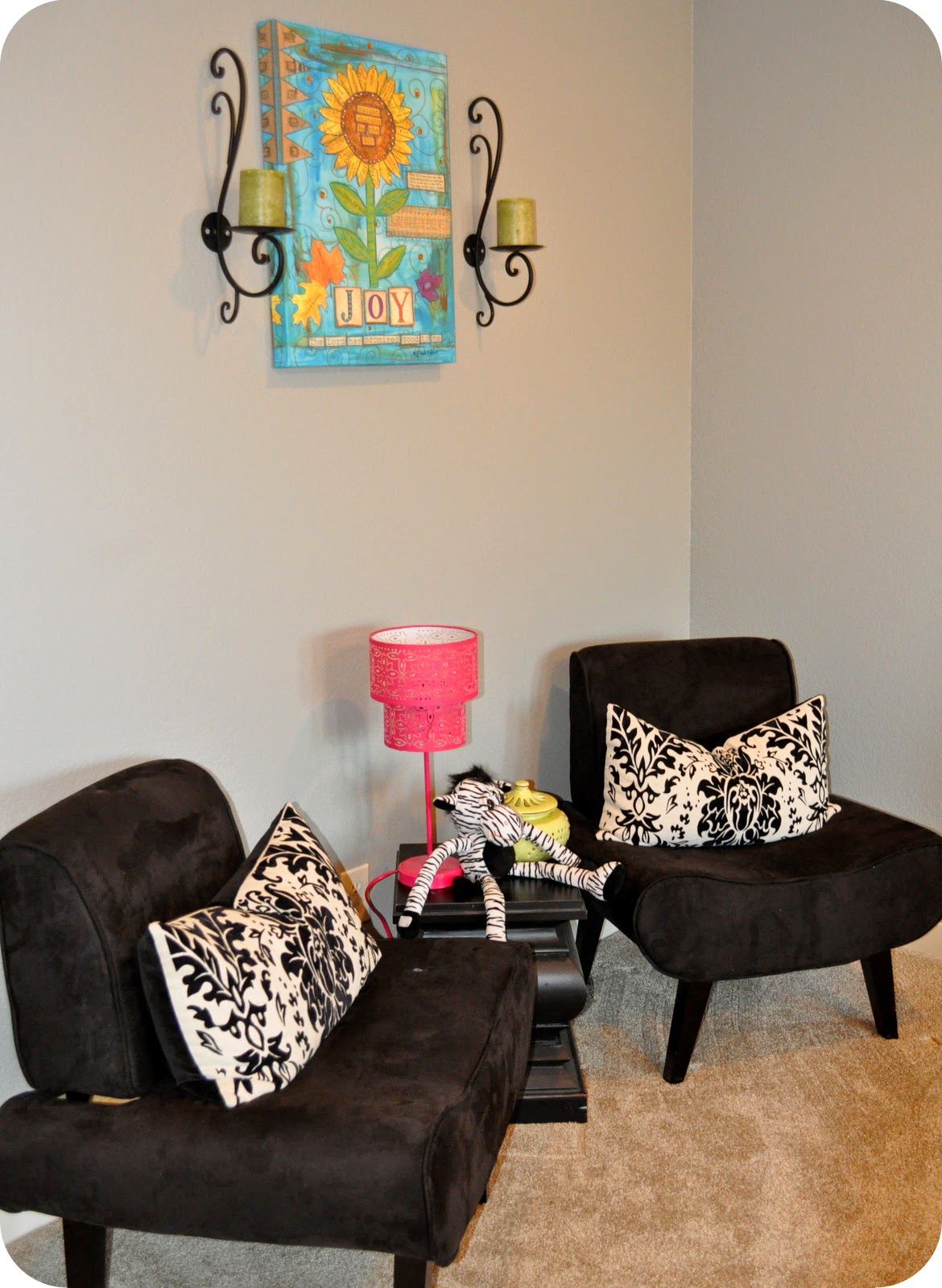 There is an area in the playroom that is tucked away and kind of separate from the rest of the space. I put these chairs that we bought from Garden Ridge years ago, and they fit perfectly!